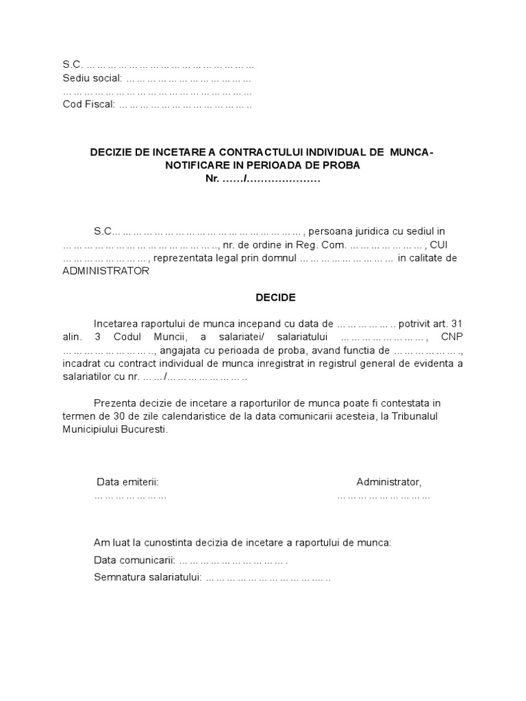 vizitati articolul complet aici : https://marianicutar.ro/2020/05/12/legislatia-muncii-explicata-pe-intelesul-tuturor-cum-se-termina-perioada-de-proba/ Un contract pe perioada nedeterminata pt o functie de executie a carui perioada de proba a expirat, perioada maxima de 90 zile, a fost. Perioada de proba reprezinta o optiune des intalnita in raporturile de munca dintre angajati si angajatori, dintre agenti de munca temporara si 31 din codul muncii, pentru verificarea aptitudinilor salariatului, la incheierea contractului individual de munca se poate stabili o perioada de proba de. 31 din codul muncii, incheierea contractului de munca pentru a verifica aptitudinile angajatului poate dura cel mult 90 de zile calendaristice, pentru functiile de executie si cel mult 120 de zile calendaristice pentru cele de conducere.